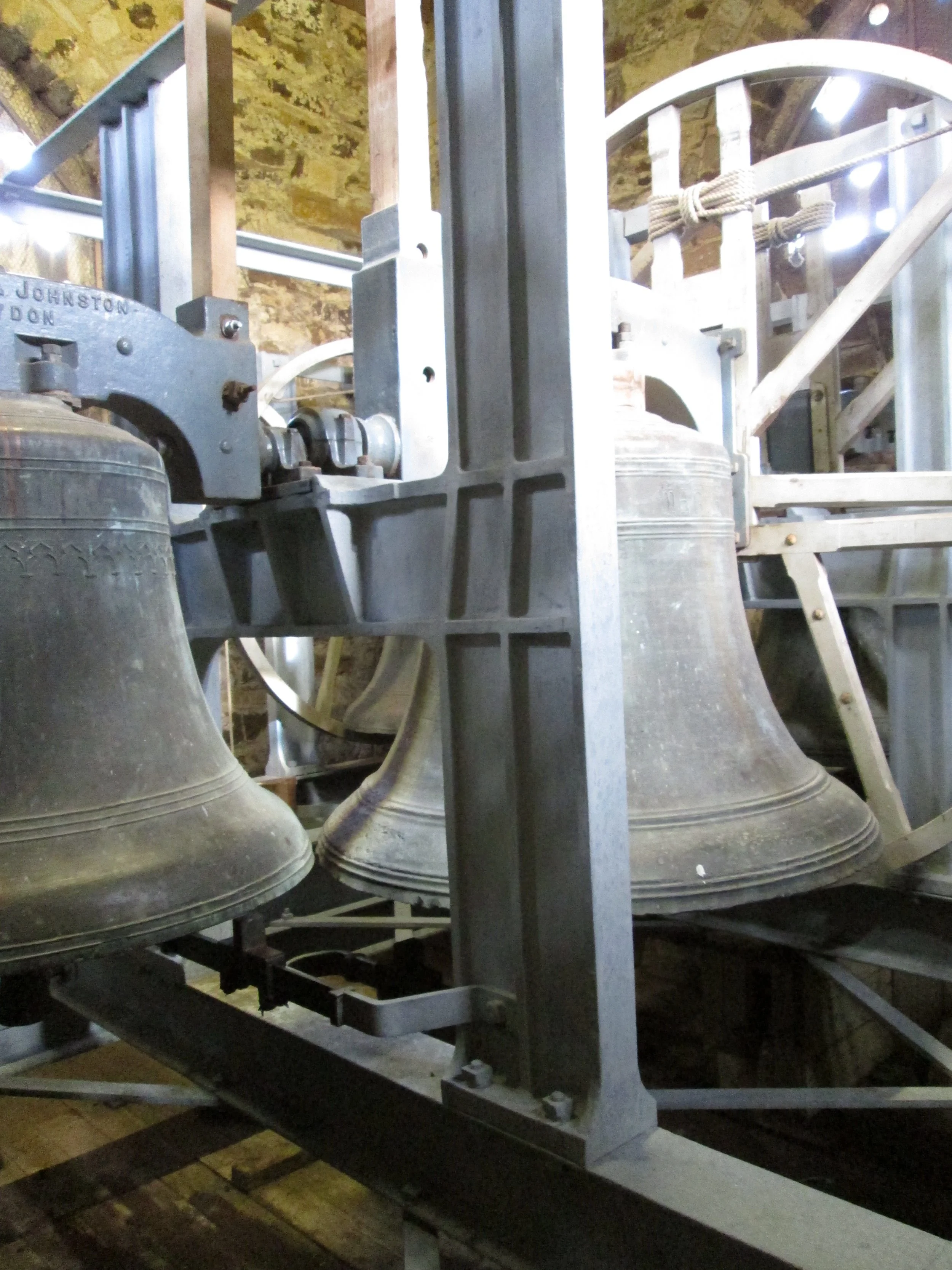 Two large, old-fashioned church bells mounted on a metal frame inside a building with wooden beams and stone walls.