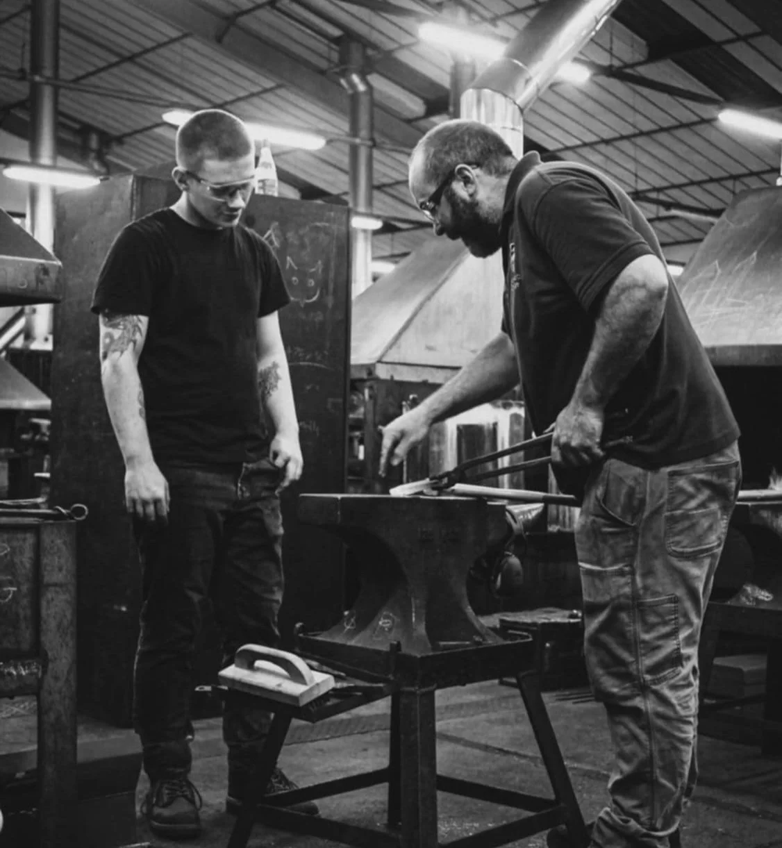 Two men in a workshop, one observing as the other uses tongs on a hot metal piece on an anvil as part of blacksmithing or metalworking process.