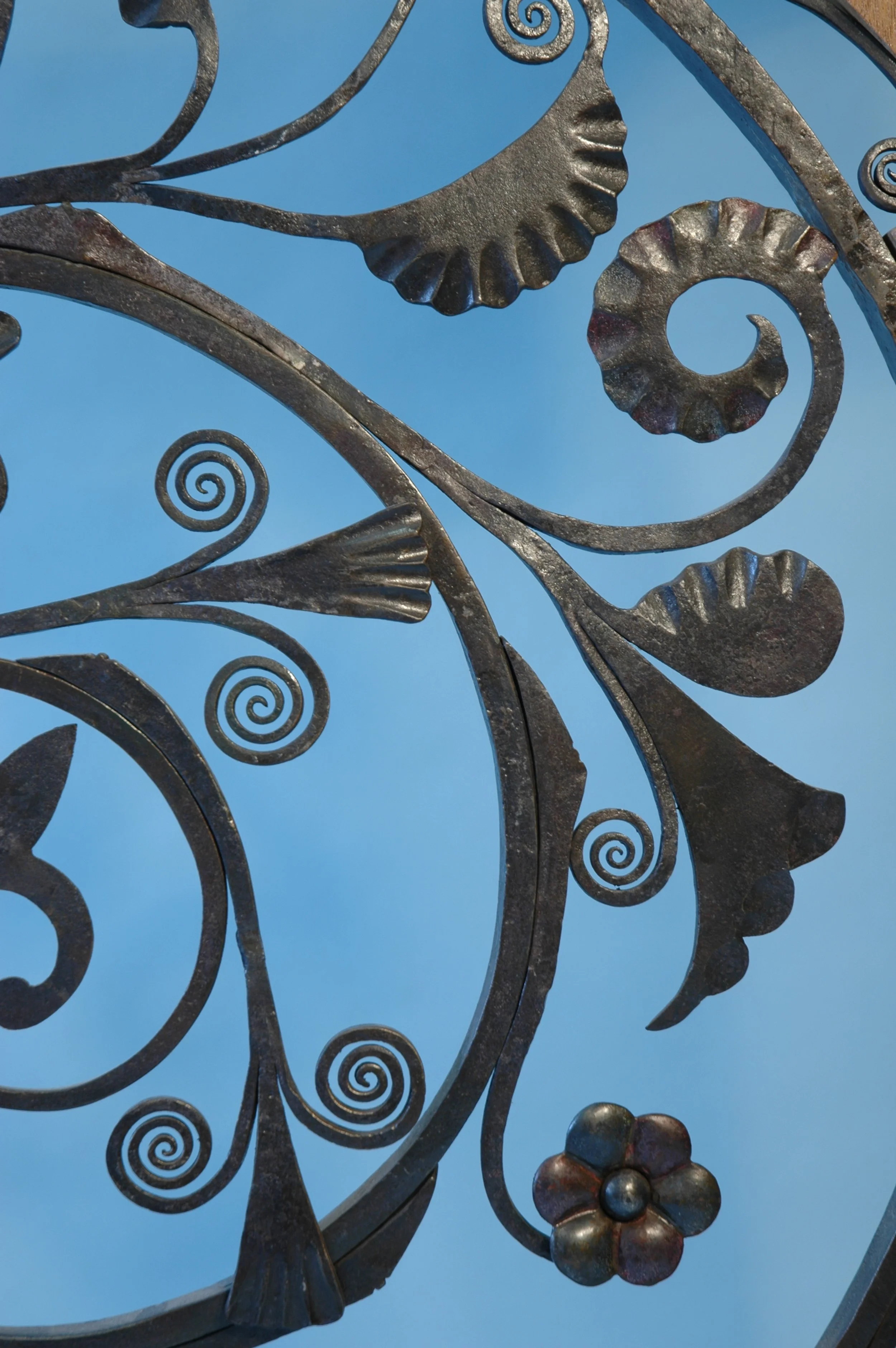 Close-up of an ornate wrought iron decorative piece with spirals, floral elements, and textured patterns against a blue sky background.