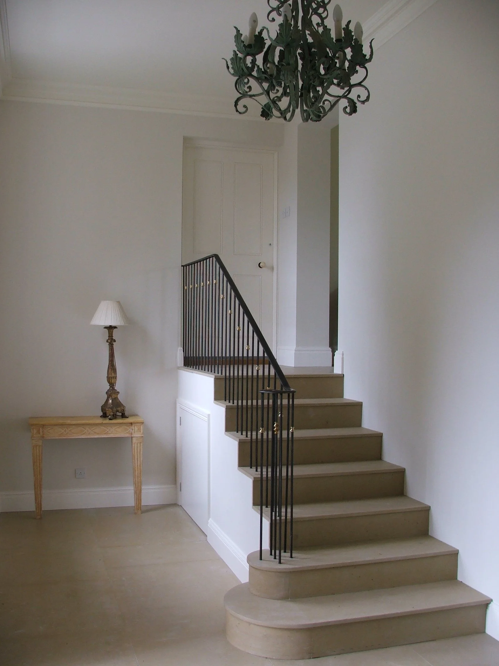 Empty room with staircase, chandelier, and side table with lamp.